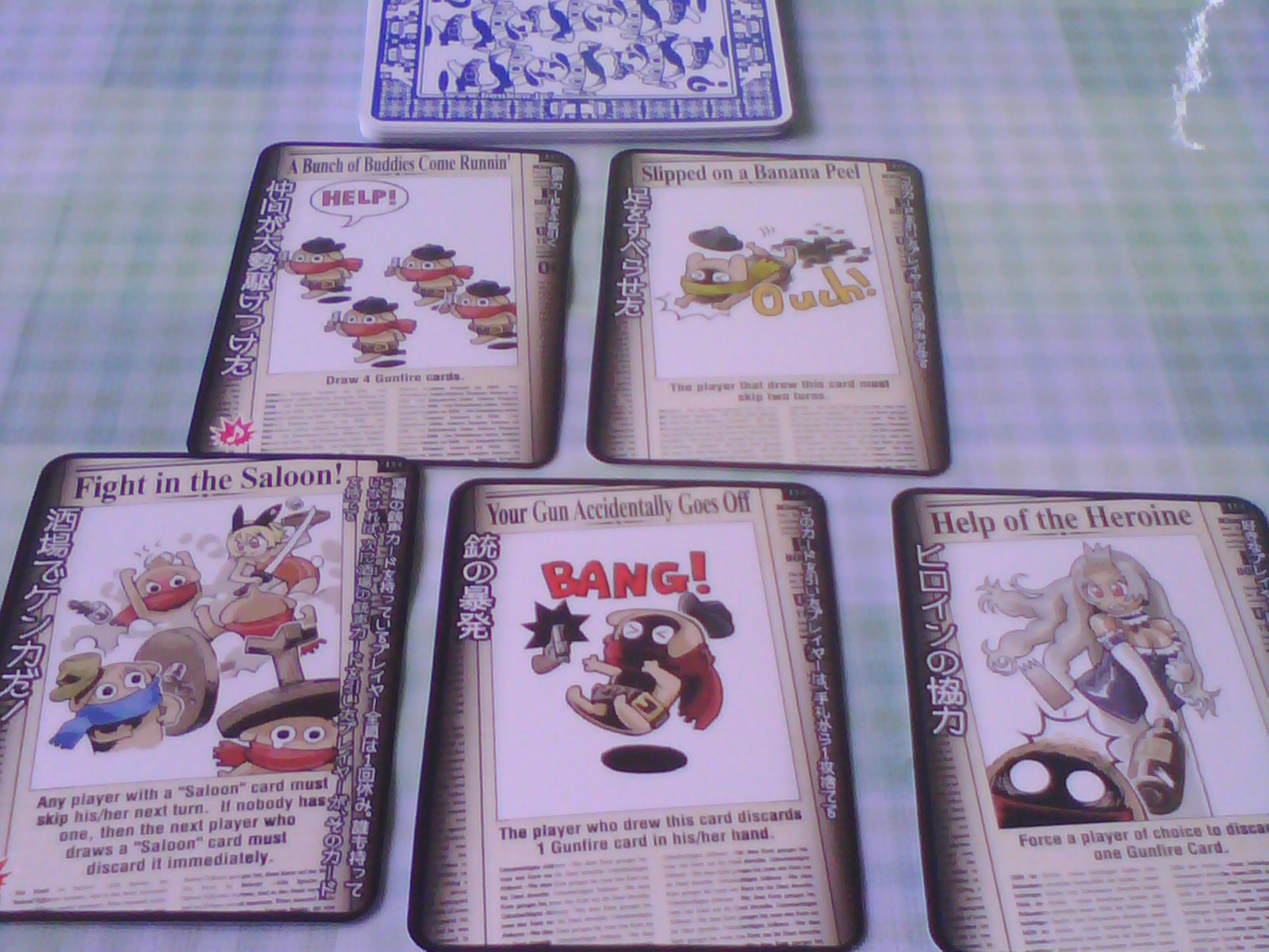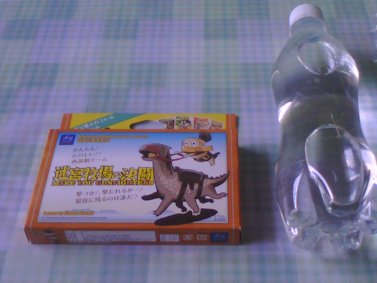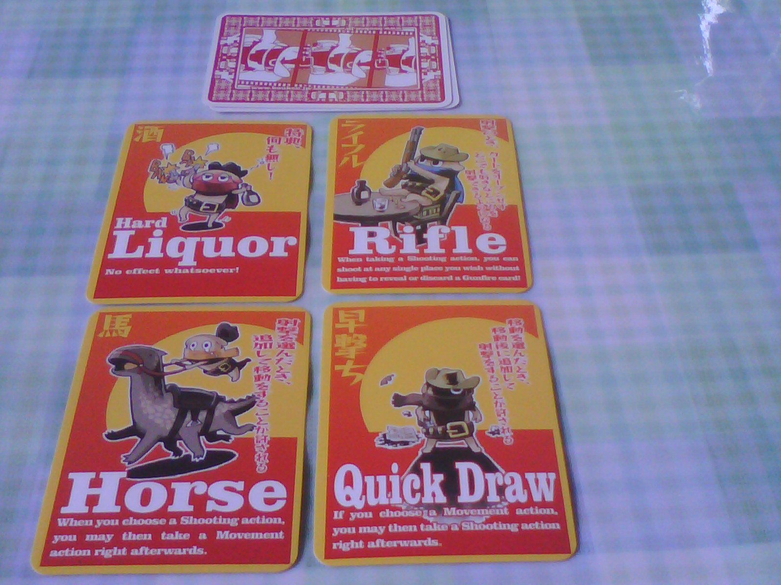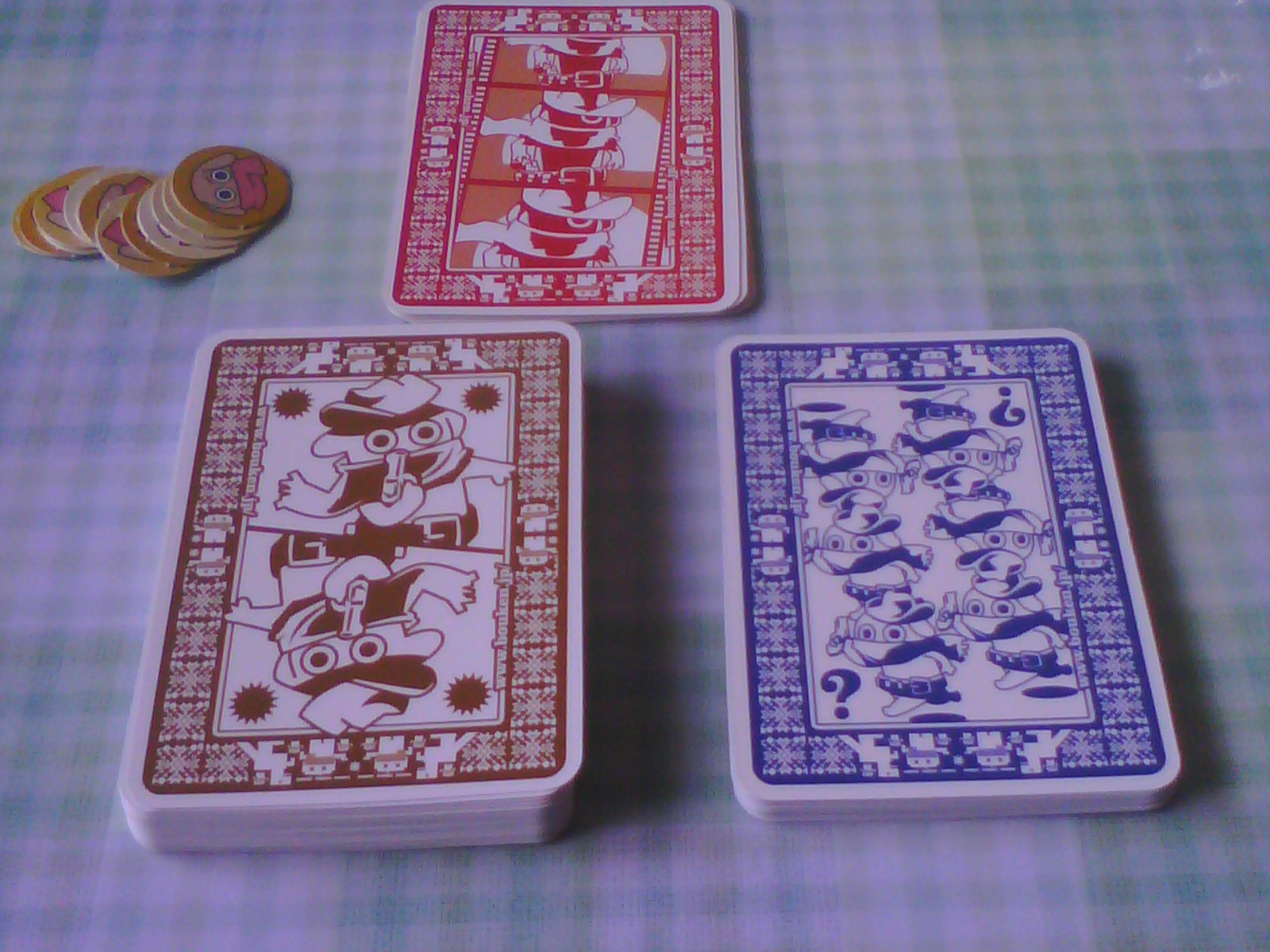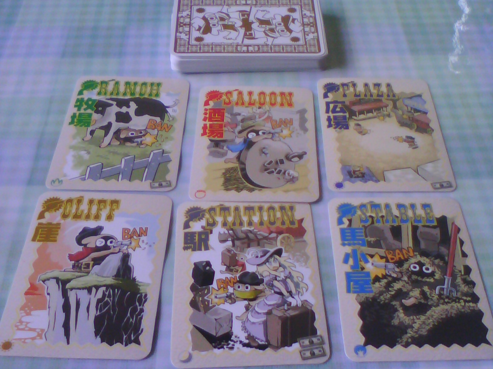 2013/06/27 Category : 未選択 迷宮牧場の決闘 「シリーズものらしいが、別に他のを知らなくても問題無し」■プレイ人数3~7人■内容物三種のカードと賞金チップガンマンカード。色々な場所と右下に賞金額が書いてある。■準備茶色のガンマンカードを5枚ずつ配る。ガンマン最後の1枚は(おっちょこちょいガンマンらしく)オープンして、他プレイヤーに見せる。このゲームは、最後まで生き残るか賞金チップを9枚集めたら勝ち。手番で出来る事は、「撃つ」か「移動する」か「物語を起こす」かのどれか。・「撃つ」他プレイヤーに自分のカードをオープンして、その場所を攻撃。牧場やら広場やら色々な場所があるわけだが、好き勝手に撃てるわけじゃない。出した手札が牧場だったら、牧場に向かって撃つという感じ。もし相手ガンマンが複数居たら、それら全員アウト。撃たれた方はカードを捨て札にする。撃った方はそのまま自分の手札に戻す。「潜んでいる場所がばれた」だけで、使い切りではない。撃って倒した相手ガンマンカードにお金の絵が描いてあれば、その分賞金チップを得られる。・「移動する」ガンマンカードを1枚捨てて、山札から1枚ガンマンカードを得る。・「物語を起こす」賞金チップを1枚払って、物語カードを引く。有利になったり不利になったり、色々な効果がある。あと、ガンマンカードが残り1枚になるとクライマックス! という事で、クライマックスカードを引く。凄く強くなる(何も変わらないハズレもあるけど)< プレイしてみた >鷹安、大義、filinion、うぃる「きっと牧場に居るはずだ! ばきゅーん」「残念、ハズレです」「どこだ酒場か? ばーん」「一人やられた」こんな感じでゲームが進む。大義「金1払うと物語(カード引ける)が発生するんですね、んじゃ、(ぺらっ) よし、仲間が駆けつけた。わーい」仲間ガンマンの数 = 体力 = 狙える場所の多さ になるので、多い方が有利。同じ場所に固まってると、やられにくい反面、当たると一気にやられちゃうけど(笑)うぃる「ガンマンが残り一人なんで、クライマックスカード引きます。・・・ライフルを手に入れた」自分の居場所がばれずに、狙撃が出来るという強いカード。さすがクライマックスカード!そしてfilinionが引いたクライマックスが・・・filinion「酒・・・特典、何も無し(笑)」終わったな(笑)うぃる「物語引こうかな・・・けど、銃が暴発ってさっき誰か引きましたよね?」鷹安「銃の暴発は2枚くらいしかなかったような気がする」うぃる「うーーーん、なんか嫌な予感がするんですが・・・うーん、ま、引いてみまs(ぺらっ)」お約束通りの銃の暴発(笑)大量の仲間を連れてきた大義君の勝利。鷹安 評価 4お手軽で、そこそこのゲーム性、そこそこの運要素、そこそこの所要時間、そこそこの盛り上がり。個人的にだが、そんなに重いゲームはやりたくないので、「そこそこ」って言うのは俺的褒め言葉。(いや、ガッツリと重いゲームをやりたい時もあるけど、往々にして軽いゲームを好む)30分から1時間程度で終わり、準備もルールも簡単で、よくまとまってる。評価5でもいいかなぁ、とも思ったけどプレイしてみて、バグというか最後にどうにもならない状況になってしまったので、そこらへんが減点。(残りプレイヤー2人で、「早撃ち」と「馬」がクライマックスだと、その時点で「早撃ち」の勝利が確定。みたいな状況だった)絵柄も可愛らしいので、ゲーム初心者や女性ゲーマー(居るのか?(笑))にもお勧めできるんじゃないだろうか。評価を書いてて気付いたけど、勝利条件が賞金(ポイント)を集める、か生き残る ってのは、「キングオブトーキョー」と同じだ。プレイ記には書かなかったが、このゲーム何回かやっていて、賞金の勝利条件でうぃる君があっという間に勝利した回もあった。他プレイヤーの残り仲間数やポイントを観察してうんぬん、というのが勝ち筋なんだろうなぁ。俺が「キングオブトーキョー」よりも好きなのは、なぜなんだろう?西部劇っていうテーマなのか、お手軽感が丁度良いのか・・・。自分のことなのに、自分で良く分からない不思議(笑)ま、結論としては、俺はこっちの方が好き。余談だが、ガンマンカード左下に、マークが描いてある。ネットで調べてみたけれど、よく分からない。調べる途中で、(迷宮牧場の町の)保安官みたいなページがあって、メールで質問を送ってみたが返答は無し(笑)ルールに書いて無くて、ゲームに特に影響無いから良いんだけど・・・シリーズものらしいので、他と併せて使うのかな?ご存じの方がいらしたら、コメント下さい。 PR Comment0 Comment Comment Form お名前name タイトルtitle メールアドレスmail address URLurl コメントcomment パスワードpassword