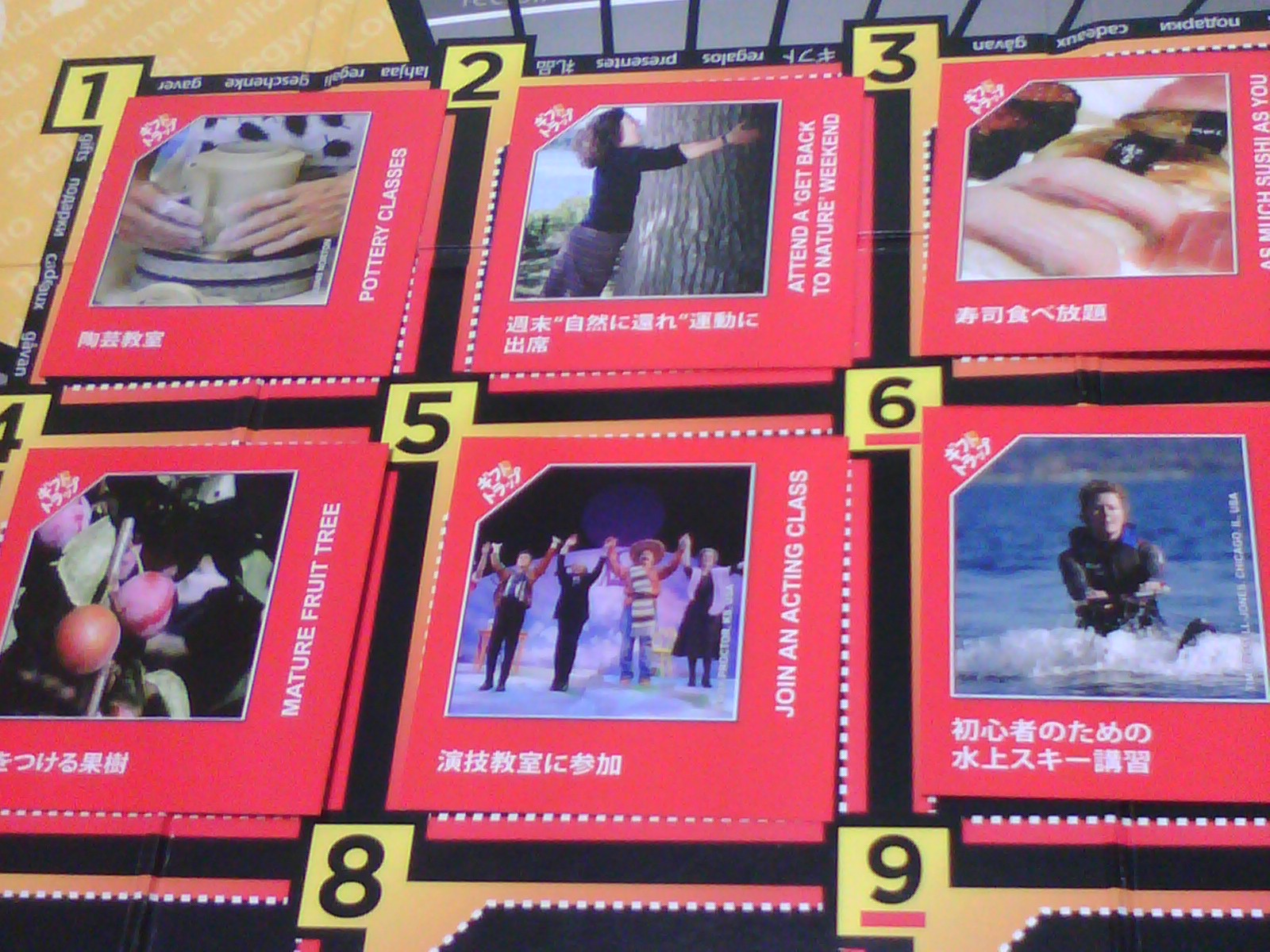 2013/03/19 Category : 未選択 マメじゃないよ(農業風味) 「マメじゃないよ」 ■プレイ人数3~6人■準備各プレイヤーに60枚のカード全てを、同じ枚数配る。ターン毎にカードを取っていき、得点が一番高い人が勝ちなカードゲーム。①コインを持っているプレイヤーが、手札から1枚選んで、カードオープン。 カードの上にコインを置く。②他のプレイヤーも手札から1枚選び、裏向きで置く。 全員出し終えたら、カードオープン。③コインを置いたプレイヤーが、他のプレイヤーが置いたカードのどれか1枚を取る。 自分で置いた(コインの置いてある)カードは、取ることができない。④カードを取られたプレイヤーが、次に残ったカードの中からどれか1枚を選ぶ。 この時もコインが置いてあるカードは取れない。⑤一番最後の人が、コインとそれが置いてあるカードを取って、次はその人が①を行う。この繰り返しで、カードが無くなるまでやる。さて、基本的には1~10までの数字が書いてあるカードを取り合い、その合計を競うのだが。特殊なカードがいくつかある。「-」カード。各色3枚ある。1枚なら、その色の得点はマイナスになってしまう。欲しくないね。でも、「-」が2枚あると、「-」×「-」でプラスになる。3枚だとやっぱりマイナス。「×2」カード。そのまんま、その色のポイントが2倍になる。プラスでもマイナスでも。「0」カード。その色の得点が0になる。プラスでもマイナスでも。このゲーム、自分に最初に配られた手札は、自分のものにならない。場に欲しいカードがあれば、親に選んで貰えるように良いカードを出す。逆に欲しいカードが無いとか親になりたいならば、いらない捨てカードを出す。そんな流れかなぁ。< プレイしてみた >鷹安、うぃる、かっしー、Kuu、あーやん最初、親のカードを公開せずにやっていたので完全な運ゲーだったが、途中でルールを思い出し戦術的ゲームへと(てへっ)。「ああっ!? 俺の(高得点)バナナがマイナスに!?(笑)」俺のバナナ(意味深)場に出された親のカードを見つつ、他プレイヤーが4種のどの色を揃えに来るのかを考察。時には自分にあまり得点にならなくても、渡してしまうと他プレイヤーの高得点になるのは阻止しなければ・・・あのカードは欲しくないから、あえて点数の少ないカードを出して~とか、考えるポイントが多い。あれだ、かなり戦術が影響する頭使う系のゲームだ。いかに他プレイヤーに「マイナス」を引かせるか(引かせないか)、「0」カードを引かせるか、自分が邪魔されずに高得点を狙うか。これはゲーマー向けだな。うぃる君は好きそうだね。鷹安 評価 4 最初に配られるカードによる運要素が少し。あとは基本的に他人の邪魔をする戦略的ゲーム。戦略は「相手の嫌がる事をする」という基本を実感させて貰える。面白いのだが、連続して何回もやるものでもない。特に友人たちと温泉宿に泊まりに行って、翌朝の頭が働いていない時にやるもんじゃあないね(笑)< 作ってあれこれ >内容物赤、青、黄、緑の4色、数字1~10まで 40枚「×2」カード、4色それぞれ1枚ずつ 4枚「 0 」カード、4色それぞれ1枚ずつ 4枚「-」カード、4色それぞれ3枚ずつ 12枚カード合計60枚。あと、親やらを判別するコイン(チップ)1枚元のゲームでは、4色の豆のイラストが描いてあるようだ。個人的に、豆は別に好きでも嫌いでもない。ドイツゲームには良く豆が出てくるのだが、あっちでは馴染みの深いものなのかもしれない。ま、どうでもいいけどw個人的には4色のデザートの方が馴染み深いので、そっちに変えてみた。赤(いちご)、青(ぶどう)、黄(バナナ)、緑(スイカ)。「×2」カード。果物が良く取れるのって、お日様の力だよね。他にも土地の栄養や雨とか色々あるんだろうけど、そこまでのリアルを誰が求めるのか(自問自答)「-」カード。風評被害で、売れたり売れなかったりするもんですよね。あとは「ダイエットに良い」とかいうブームとか。良くも悪くも、日本人は流行に流されやすい人種な気がする。「0」カード。プラスにもマイナスにもならない。実際には畑の肥やしにする為に潰したり、燃やしたりするんだろうけど、俺的には動物に食べて貰おうと思った。あとコインを裏返すと、友人鉛君の顔が出現するw本人未承諾ほら、俺らの中で一番農業経験者だから。(ご実家が農家だそうで)ちなみにどうでも良いことだが、友人鉛君のコインは出オチで、中盤以降全く触れられなかった(笑)